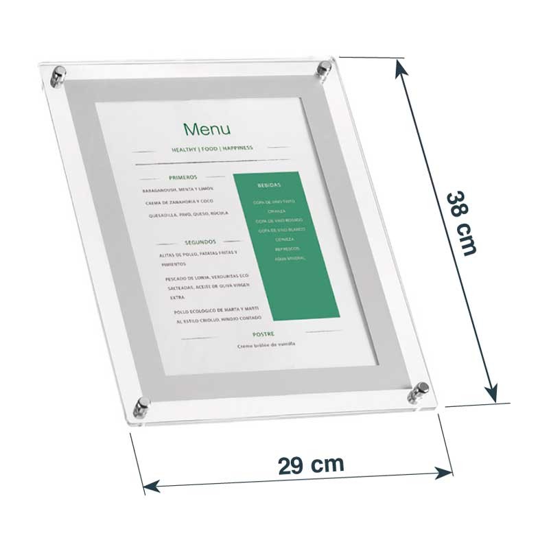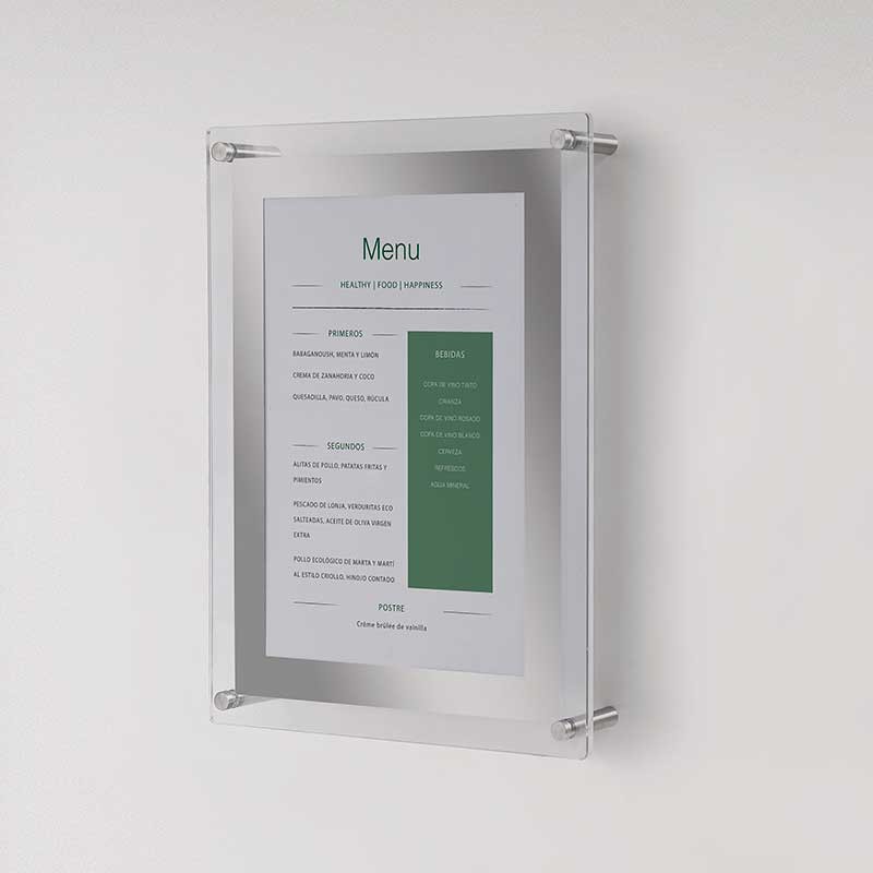 Porta menu formato A4 con pannello acrilico. 3 opzioni di montaggio: stand, a parete e desktop.