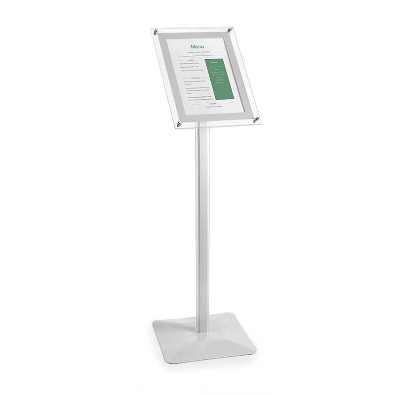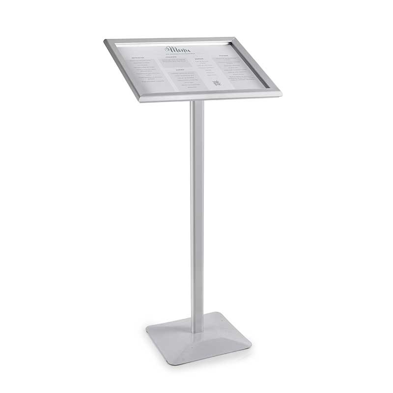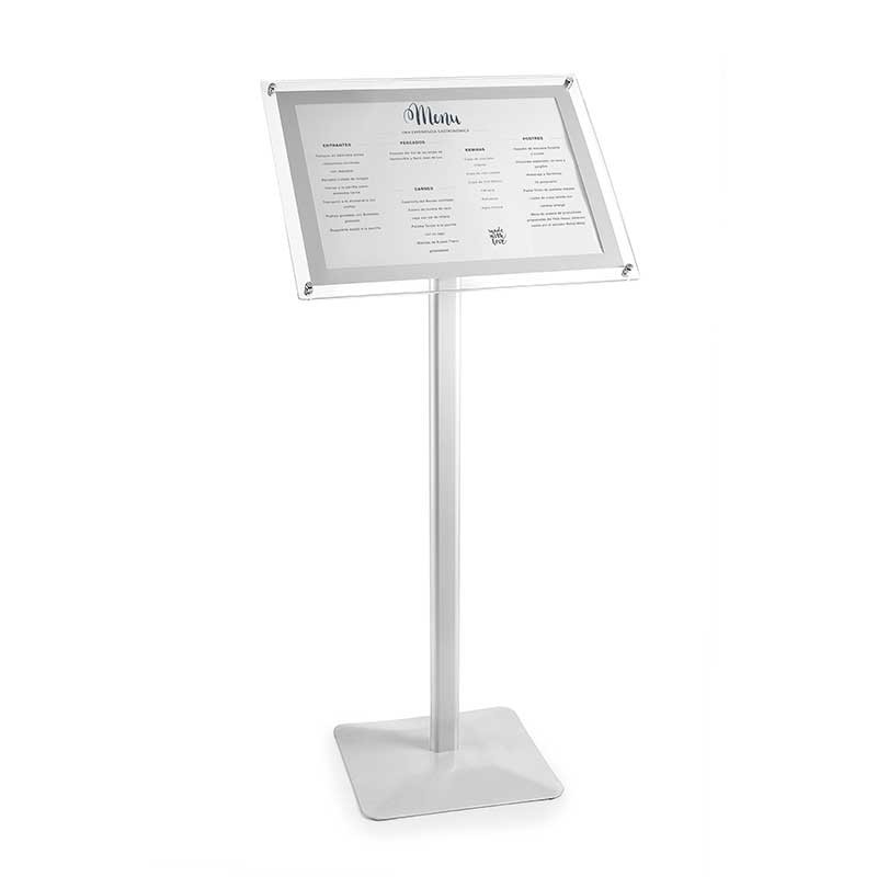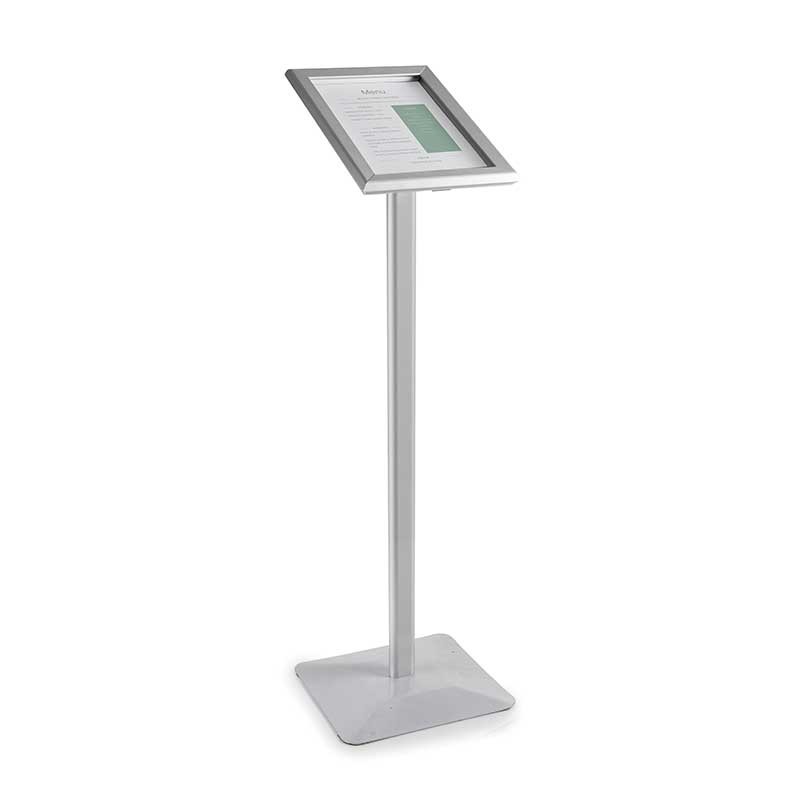 Leggio porta menu in alluminio adatto per visualizzare i menu di formato A4 / A3 in interno ed in esterno. Non include porta menu.