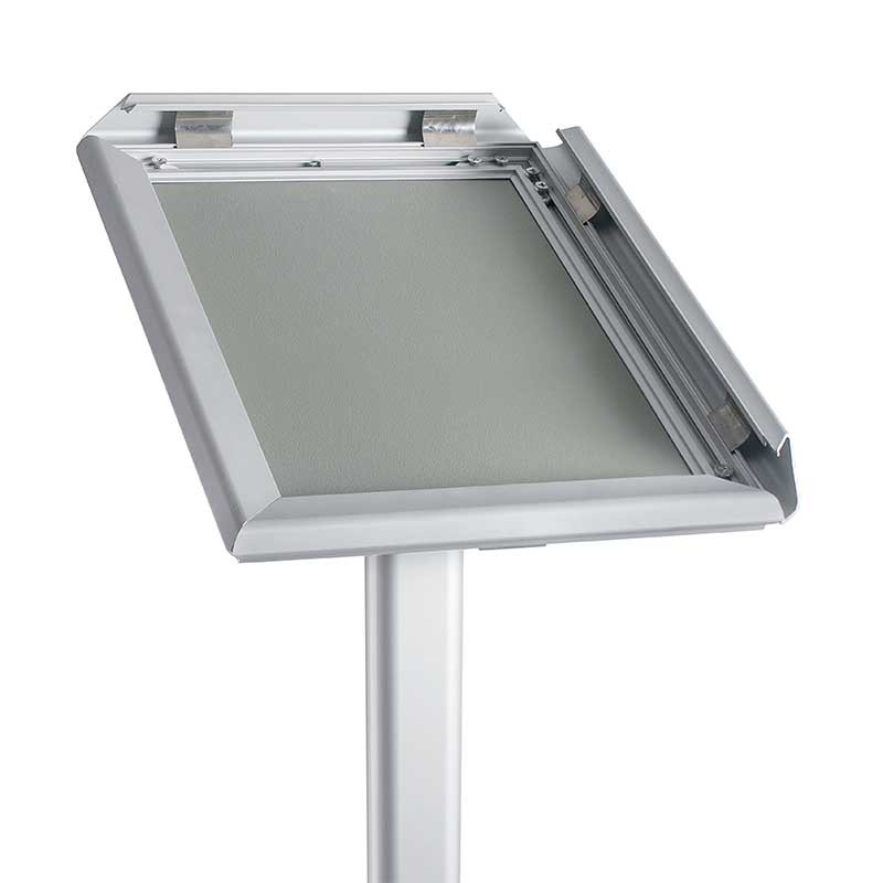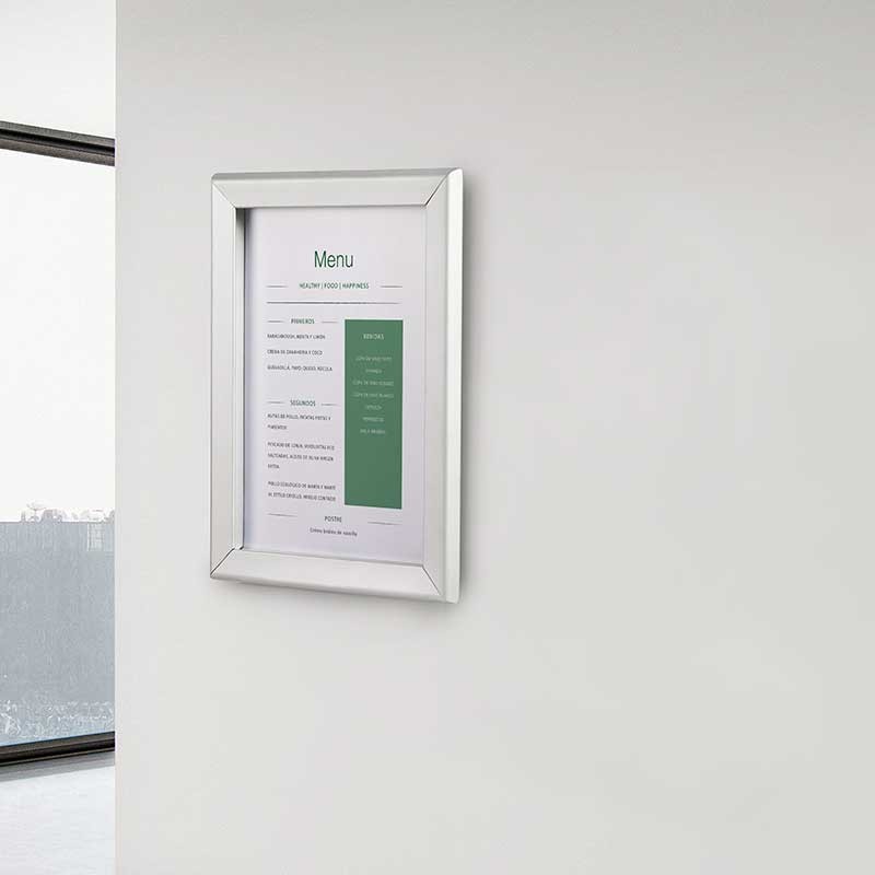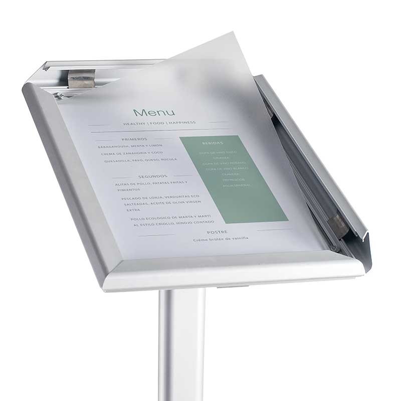 Porta menu formato A4 con supporto in alluminio. Telaio in apertura con un solo clic. 2 opzioni di montaggio: stand e la parete.