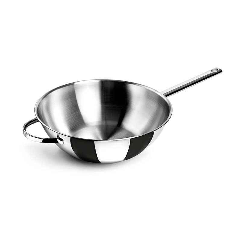Wok modello Belly realizzato in acciaio inox 18/10 con fondo termodifusor panino adatto per fornelli a induzione, fornelli elettrici e a gas fornelli.
