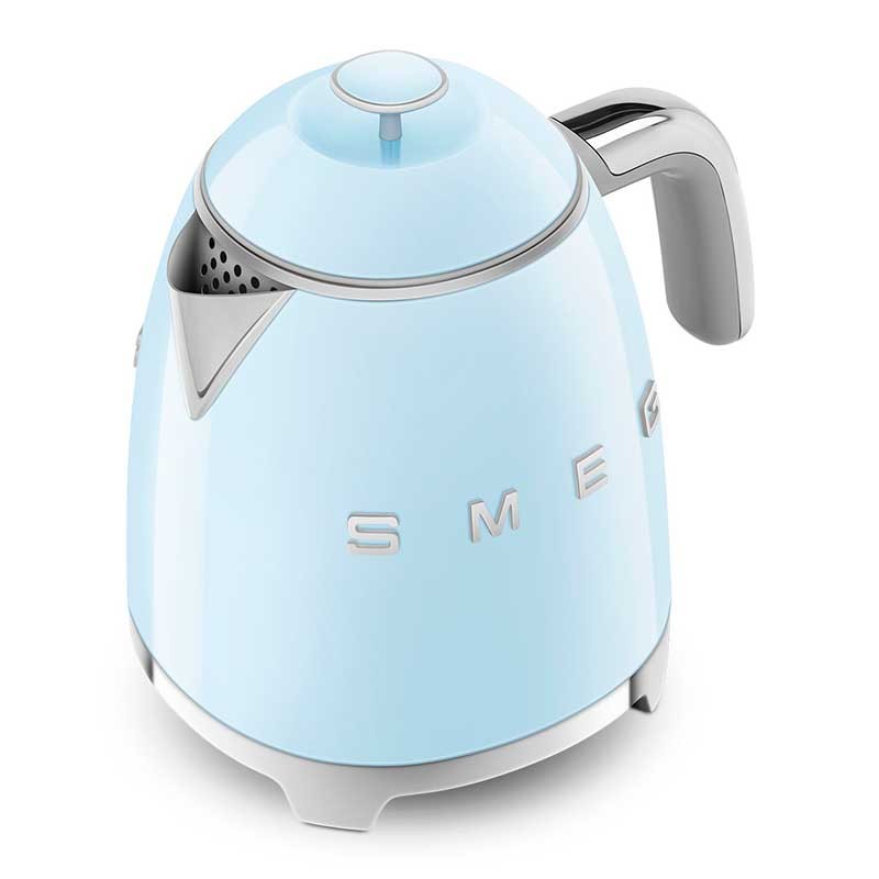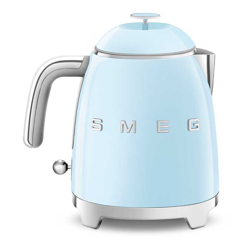Mini bollitore da 0,8 litri stile Smeg 50 con corpo in plastica, finitura lucida blu cielo e base girevole a 360º.