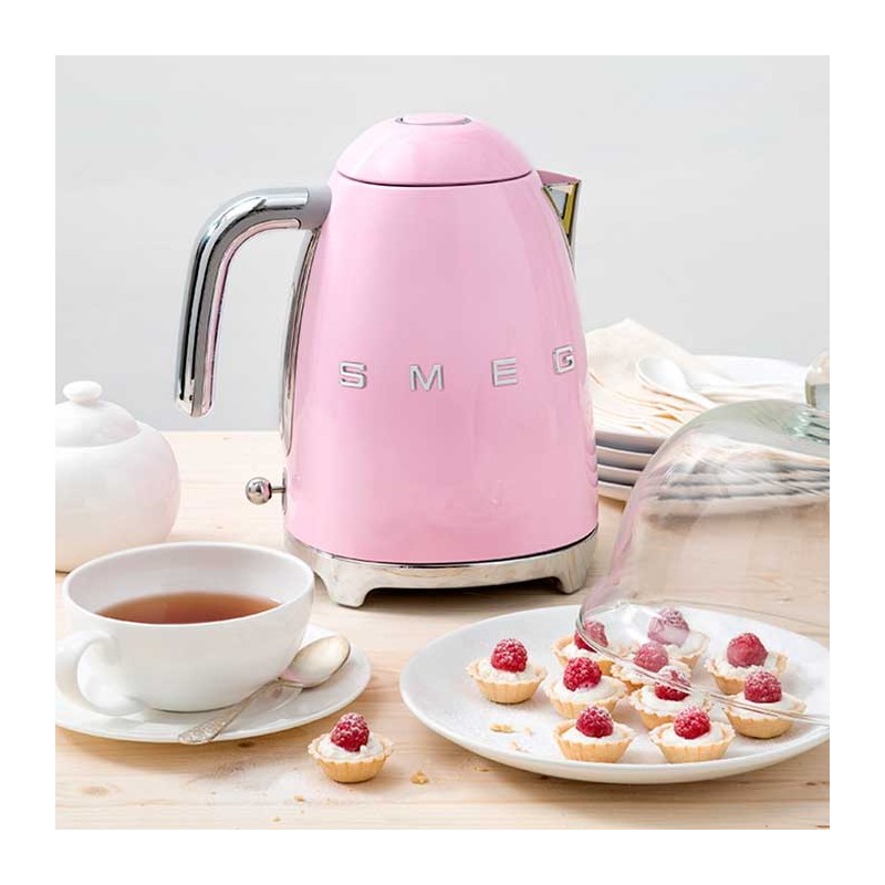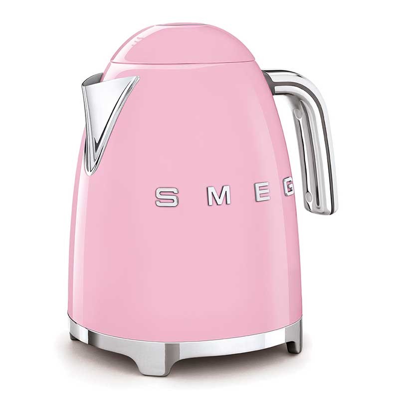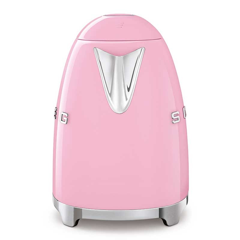 Bollitore standard Smeg 50's Stile 1,7 litri con corpo in acciaio inox finitura rosa lucido e base girevole a 360°.