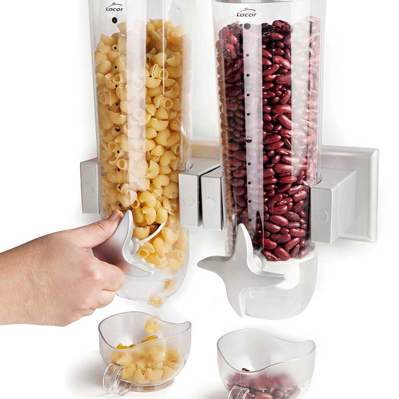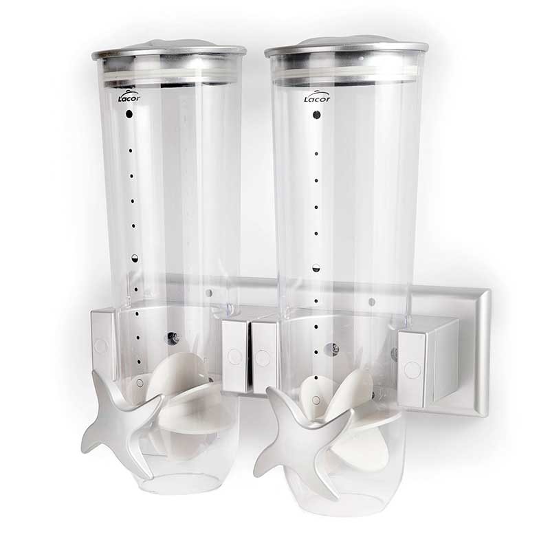 Dispenser doppio cereali sistema a parete con rotazione di consegna, di facile utilizzo. Ideale per i cibi come cereali, farina d'avena, pasta, caffè, frutta secca, ecc