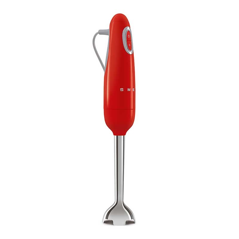 Frullatore a immersione Smeg 50's stile finitura rosso lucido con 700 W di potenza, velocità variabile e funzione turbo.