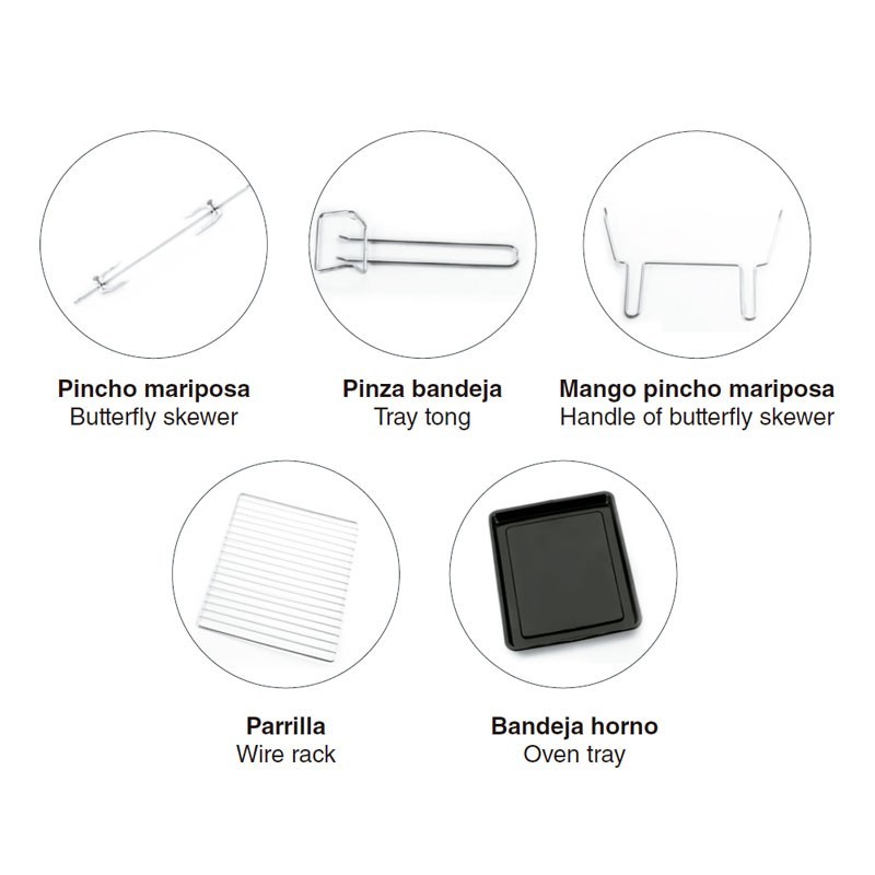 Questo piccolo forno funzione grill è ideale per l'immissione sul banco in cucine con poco spazio a disposizione, e si può rimuovere facilmente, staccando la spina dalla presa di corrente e conservarlo fino all'utilizzo successivo. Oltre alle sue grandi caratteristiche, inoltre, include i seguenti accessori: