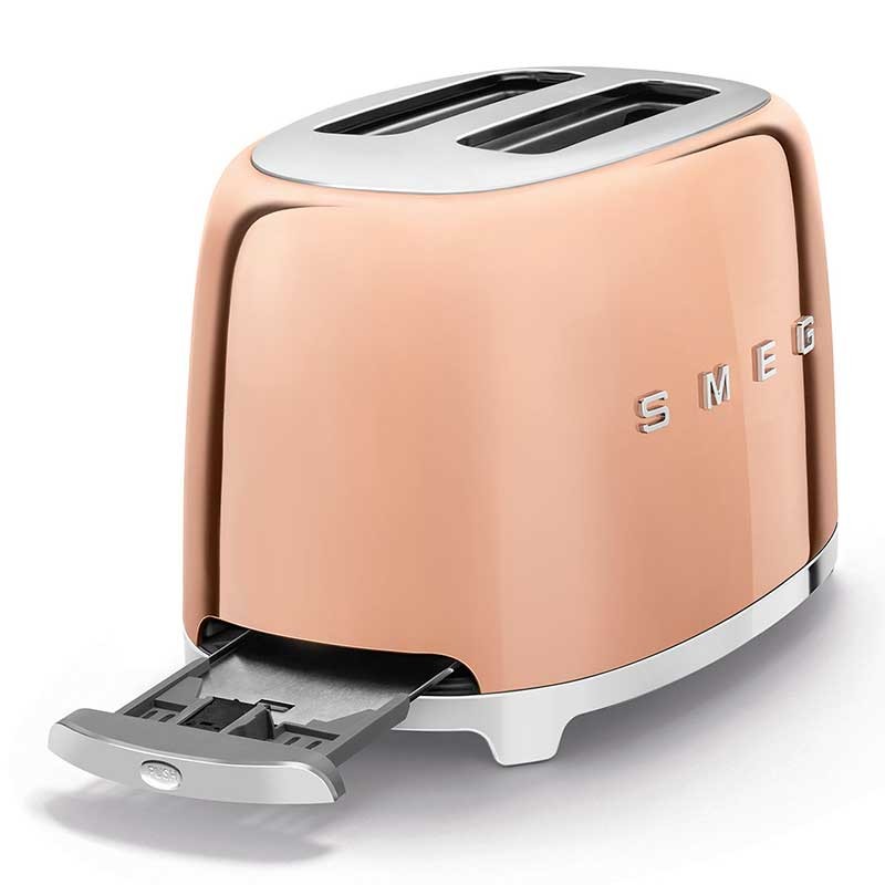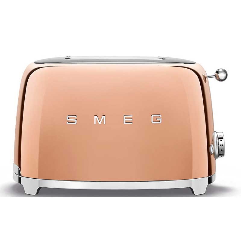 Tostapane stile Smeg 50 con corpo in acciaio inox oro rosa lucido con 6 livelli di riscaldamento e 2 slot per 2 toast.