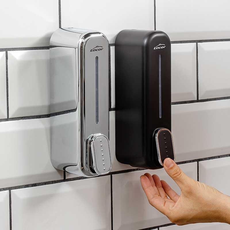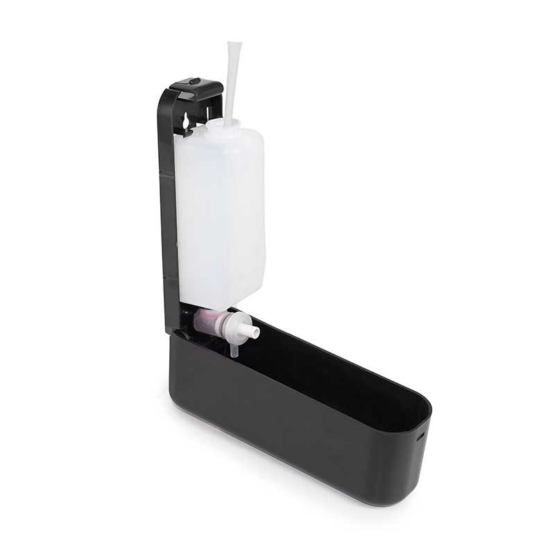 Dispenser di sapone o gel idroalcolico realizzati in ABS nero con polietilene serbatoio 350 ml di capacità.