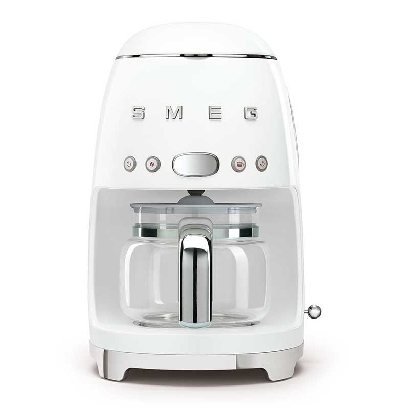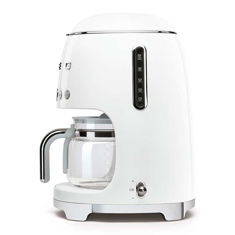 Macchina da caffè a goccia-filtro Stile Smeg 50 con selezione dell'intensità del caffè regolabile e corpo in acciaio inossidabile e finitura ABS bianco lucido.