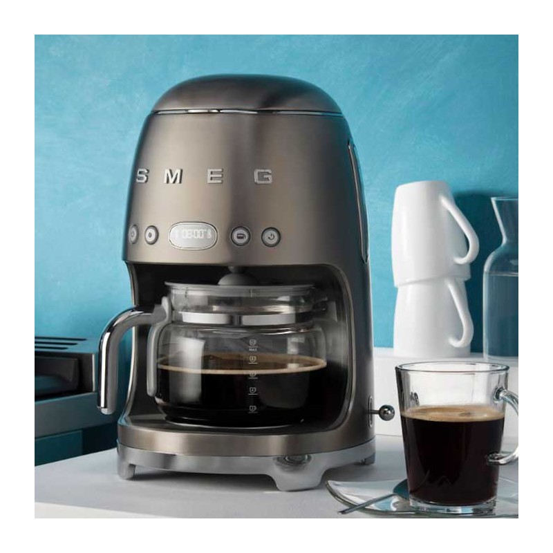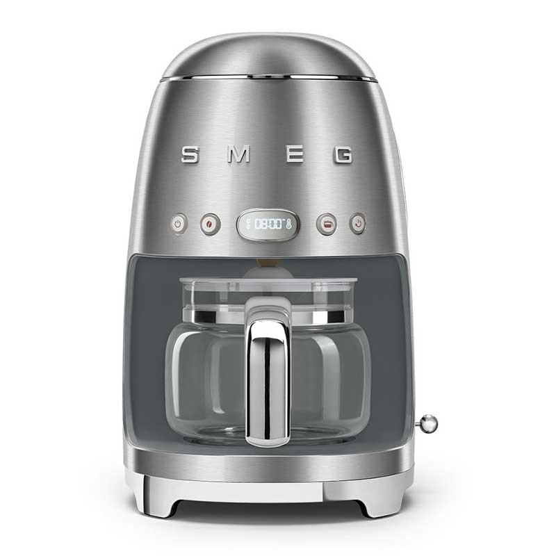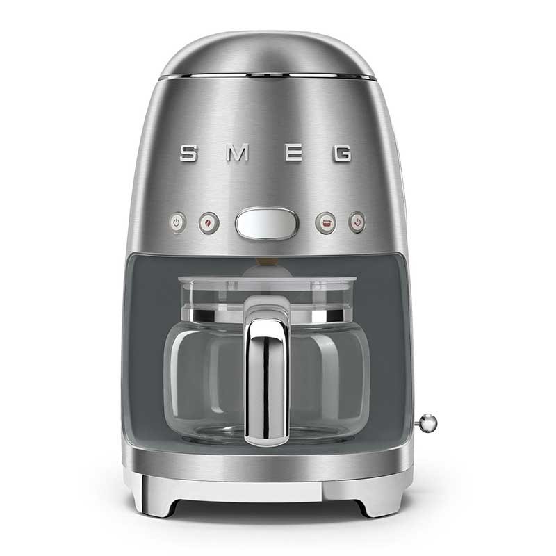 Macchina da caffè a goccia stile Smeg 50 con selezione dell'intensità del caffè regolabile e corpo in acciaio inossidabile spazzolato e ABS.