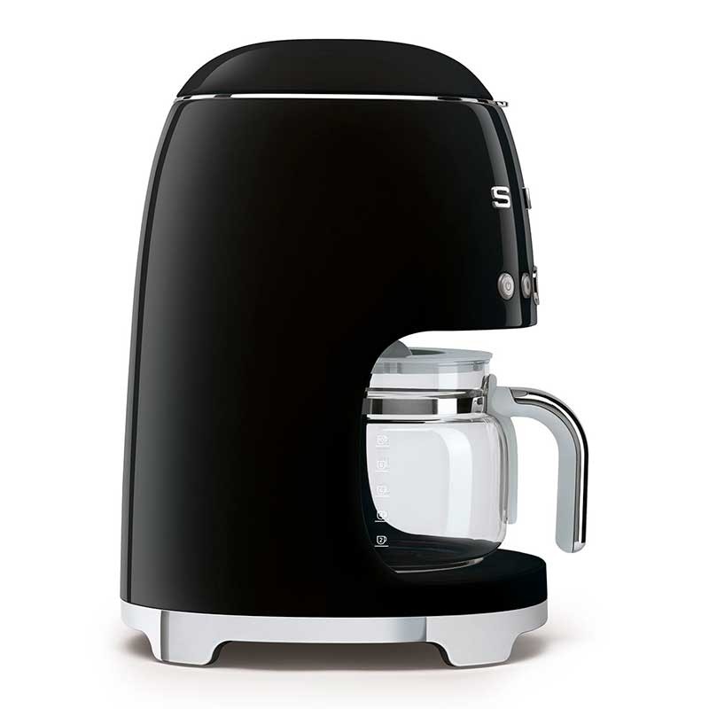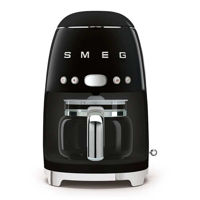 Macchina da caffè a goccia-filtro Stile Smeg 50 con selezione dell'intensità del caffè regolabile e corpo in acciaio inossidabile e finitura ABS nero lucido.