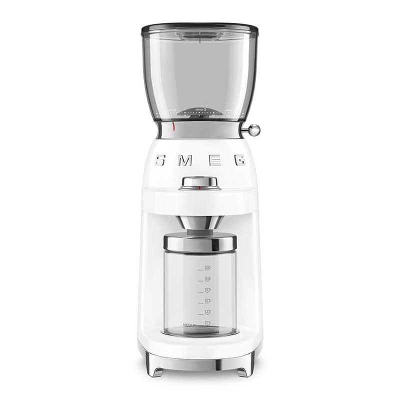 Espandere Macinacaffè elettrico stile Smeg 50 con 30 diversi livelli di macinazione del grano e corpo in acciaio inossidabile con finitura bianca lucida.