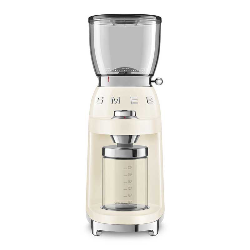 Espandere Macinacaffè elettrico stile Smeg 50 con 30 diversi livelli di macinazione del grano e corpo in acciaio inossidabile con finitura crema lucida.