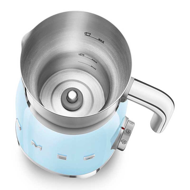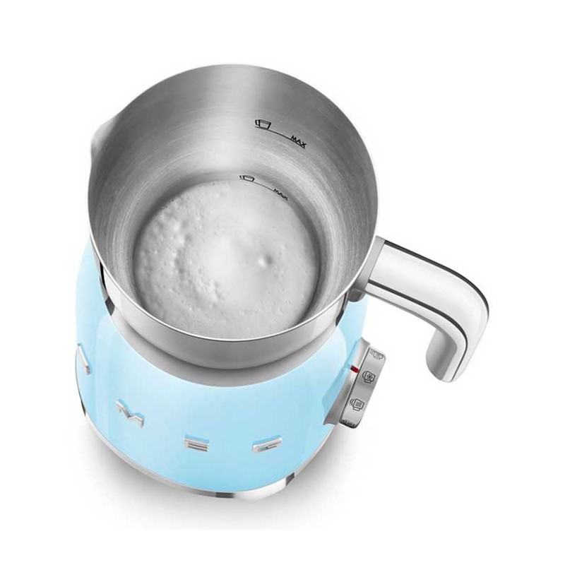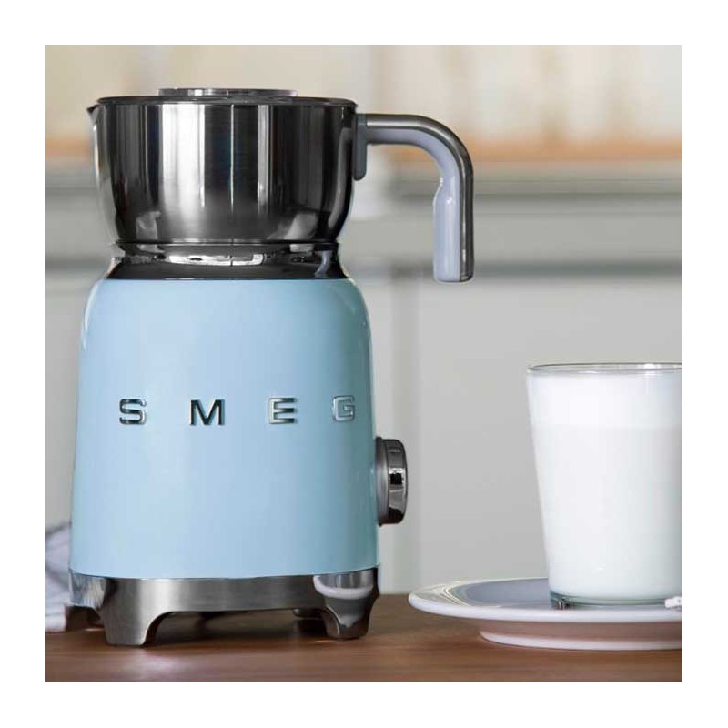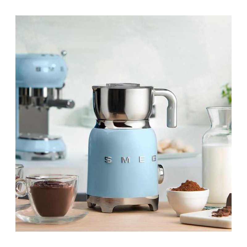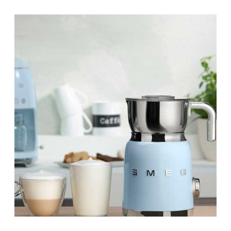 Montalatte stile Smeg 50 con corpo in acciaio inox con finitura lucida celeste e 6 programmi per preparare bevande calde o fredde con o senza schiuma.