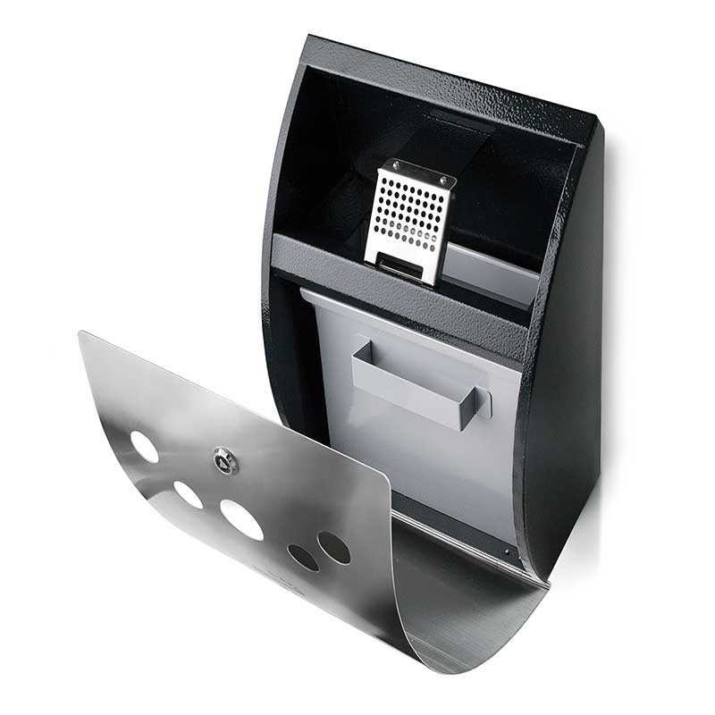 Posacenere per fissaggio a muro realizzato in acciaio zincato con coperchio design discreto ed elegante in acciaio inox 18/10.