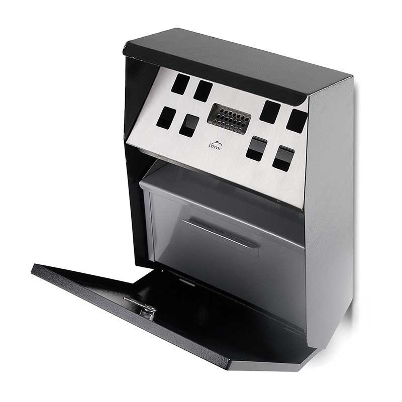 Il posacenere dispone di una serratura a chiave per accedere alla casella di interni in acciaio zincato, rimovibile per una facile pulizia. Esso comprende il materiale necessario per il fissaggio a muro e di un triangolare di sicurezza chiave per aprire la scatola.