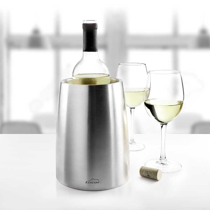 Enfriabotellas in acciaio inossidabile 18/10 satinato con doppia parete di isolamento per meglio tenere fuori il freddo senza l'utilizzo di ghiaccio.