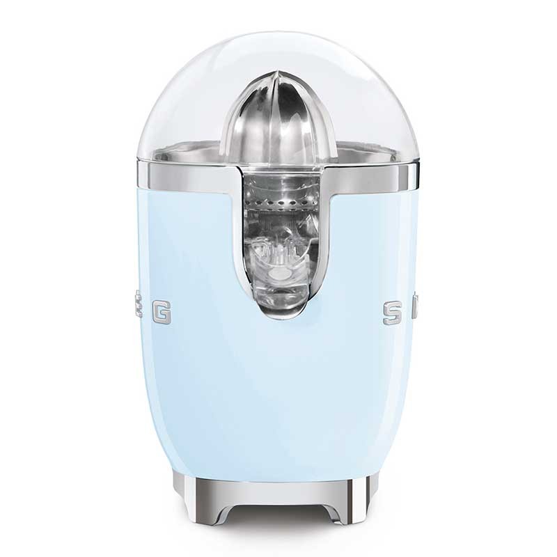 Spremiagrumi manuale stile Smeg 50 70W con corpo in alluminio pressofuso finitura lucida blu cielo e cono in acciaio inossidabile.