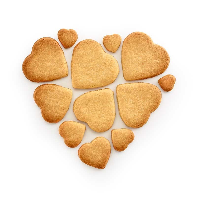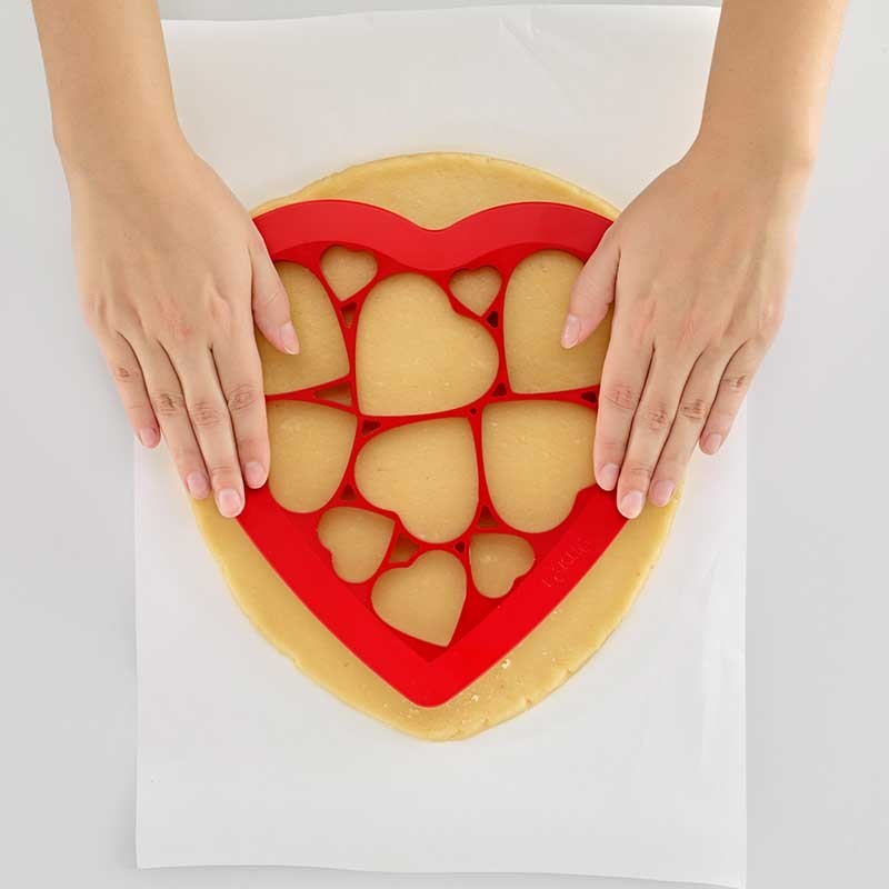 Dà cuori di forma e veloce, semplice e originale. Un unico stampo con 12 figure di cuore a lui per mettere su massa tutti in una volta e averli pronti da cuocere nel forno.