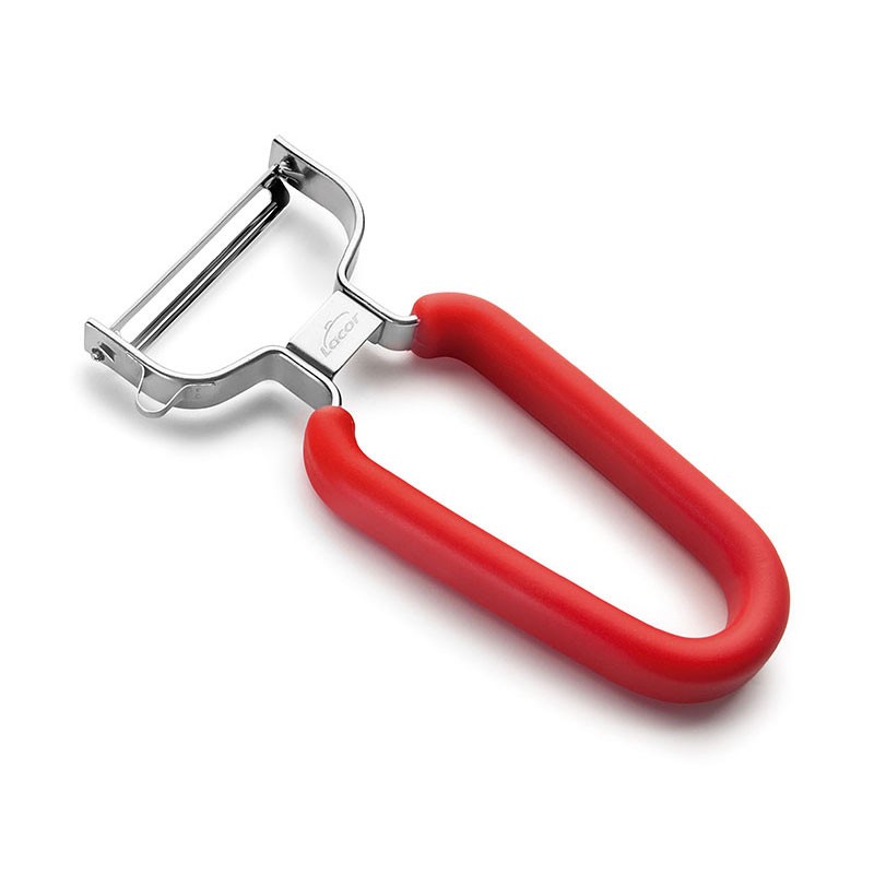 Pelapatate "E" 12.5 cm di lunghezza, realizzato in acciaio inox di alta qualità con manico in termoplastica, rosso.