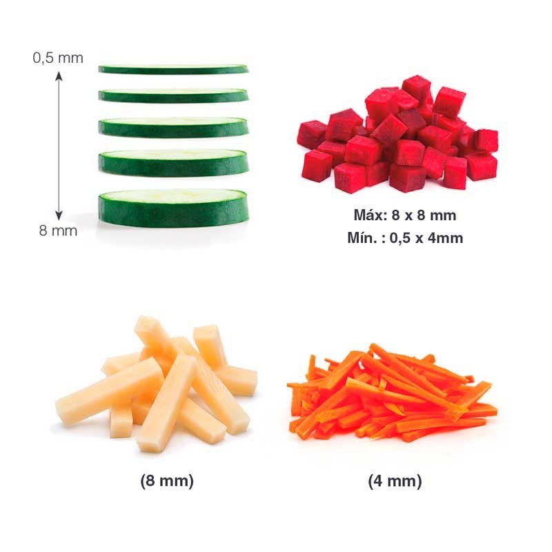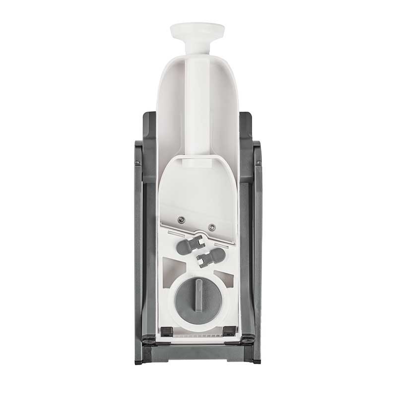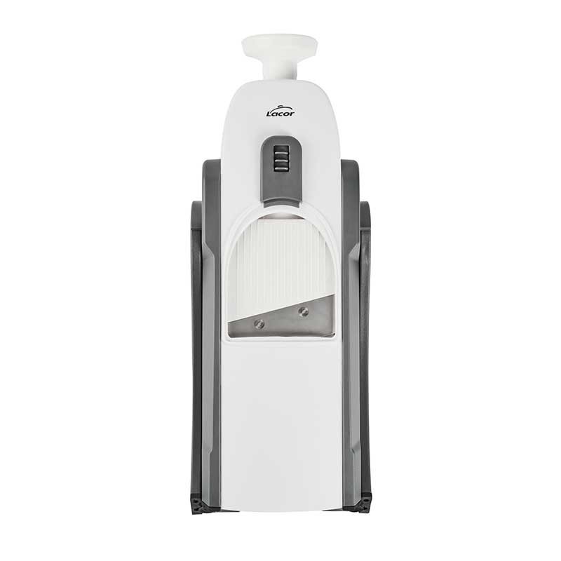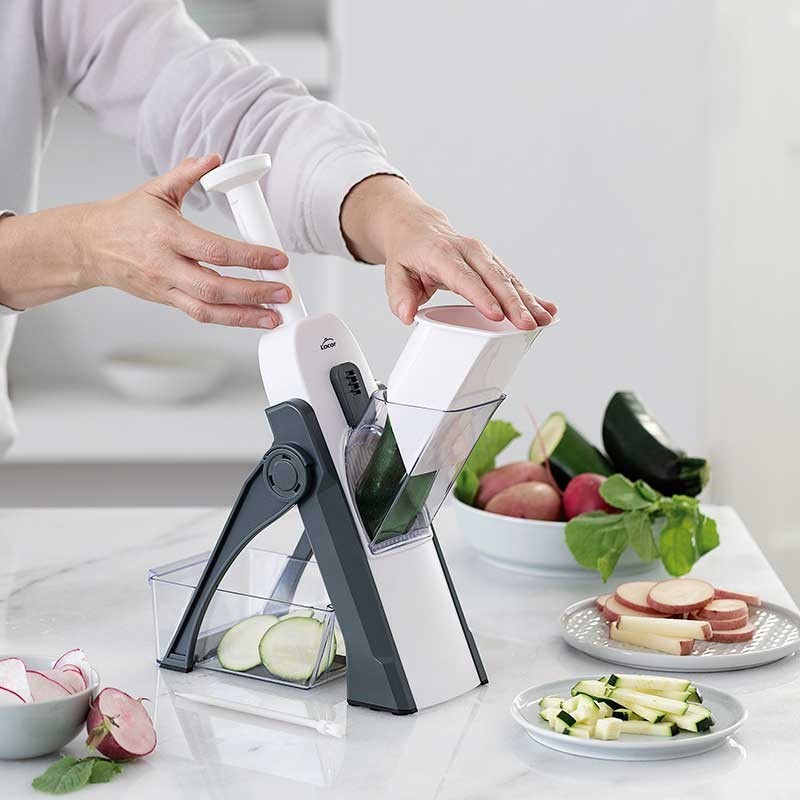 Mandolino multifunzione con 4 tipi diversi di taglio e dal sistema di azionamento verticale leva di ritorno automatico.