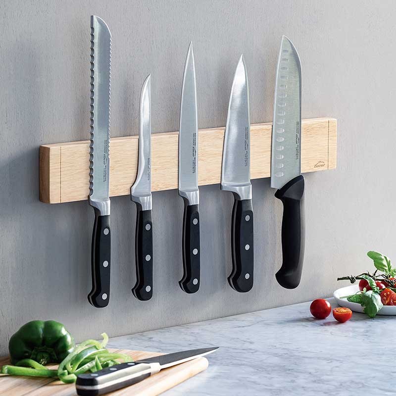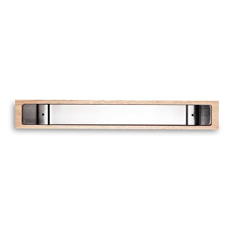 Elegante supporto magnetico per coltelli da cucina realizzato in legno di gomma. Include tutto il necessario per il montaggio.