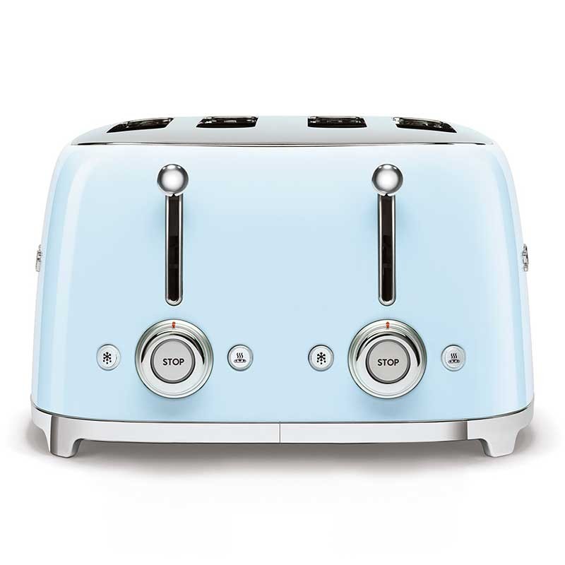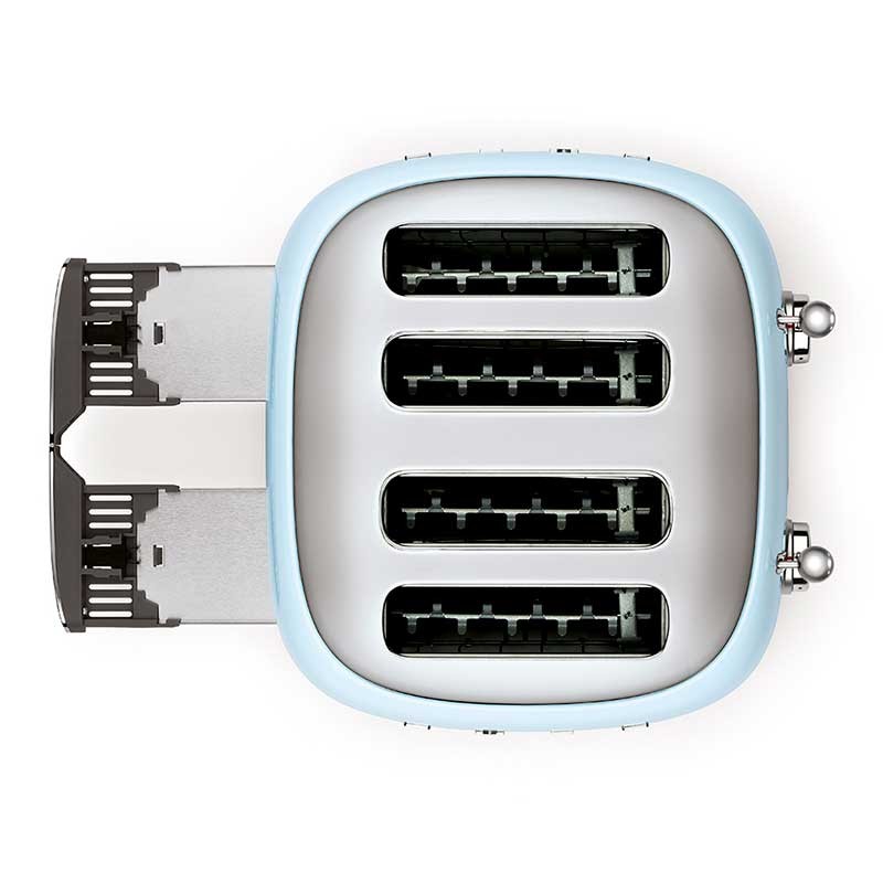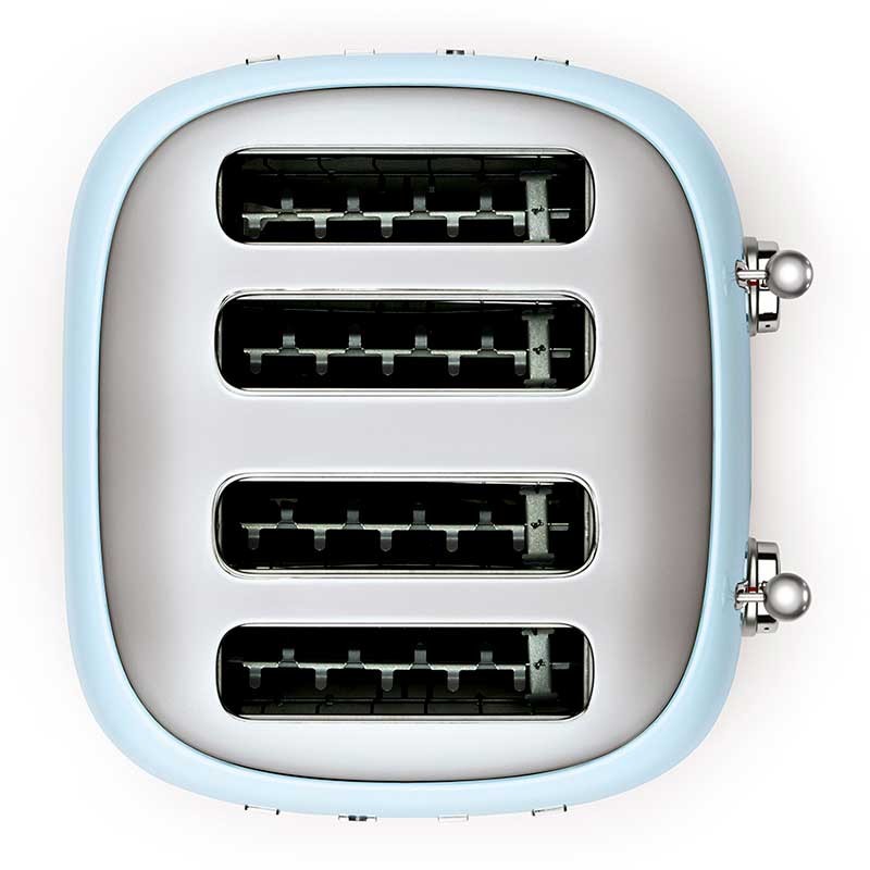 Tostapane stile Smeg anni ' 50 con corpo in acciaio inox di colore celeste brillante con 6 livelli di riscaldamento e 4 slot per 4 toast.