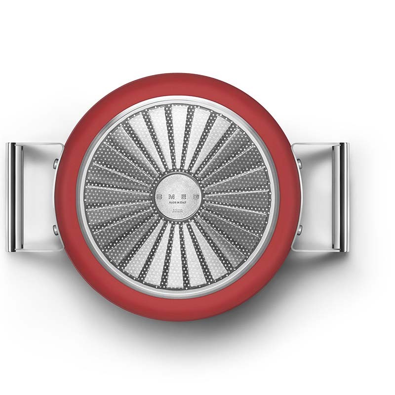 Casseruola antiaderente con coperchio stile Smeg 50, diametro 24 cm, corpo in alluminio forgiato e finitura esterna rosso opaco.