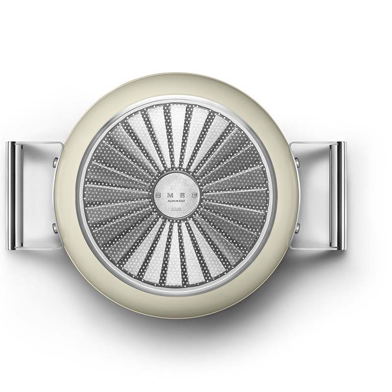 Casseruola antiaderente con coperchio stile Smeg 50's, diametro 24 cm, corpo in alluminio forgiato e finitura esterna beige crema opaca.
