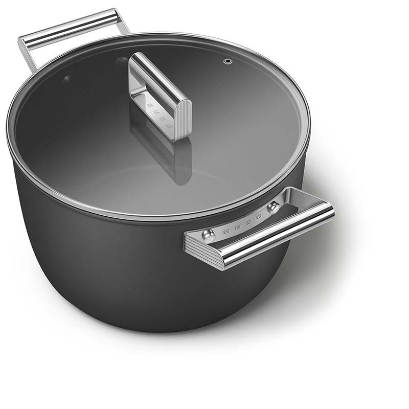Casseruola alta antiaderente con coperchio in stile Smeg 50 di 26 cm di diametro, corpo in alluminio forgiato e finitura esterna nera opaca.