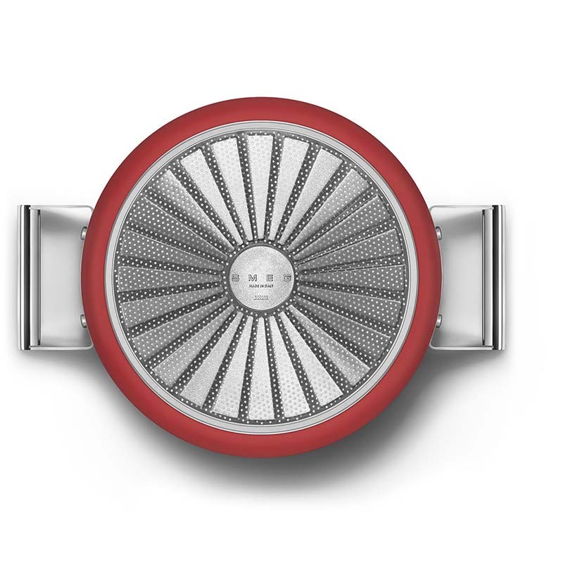 Casseruola alta antiaderente con coperchio in stile Smeg 50 di 26 cm di diametro, corpo in alluminio forgiato e finitura esterna rossa opaca.
