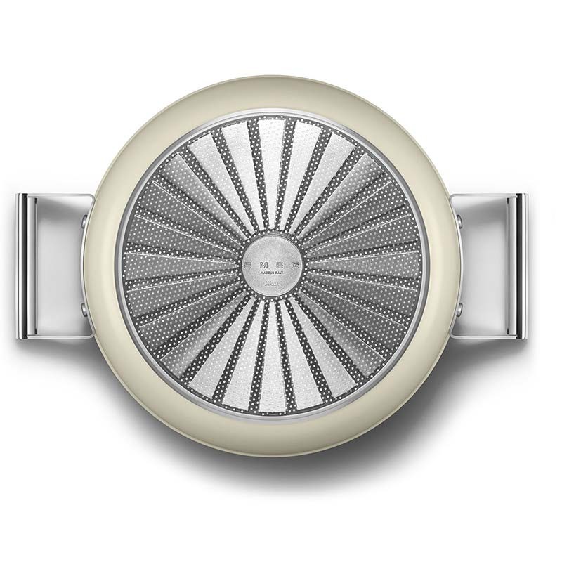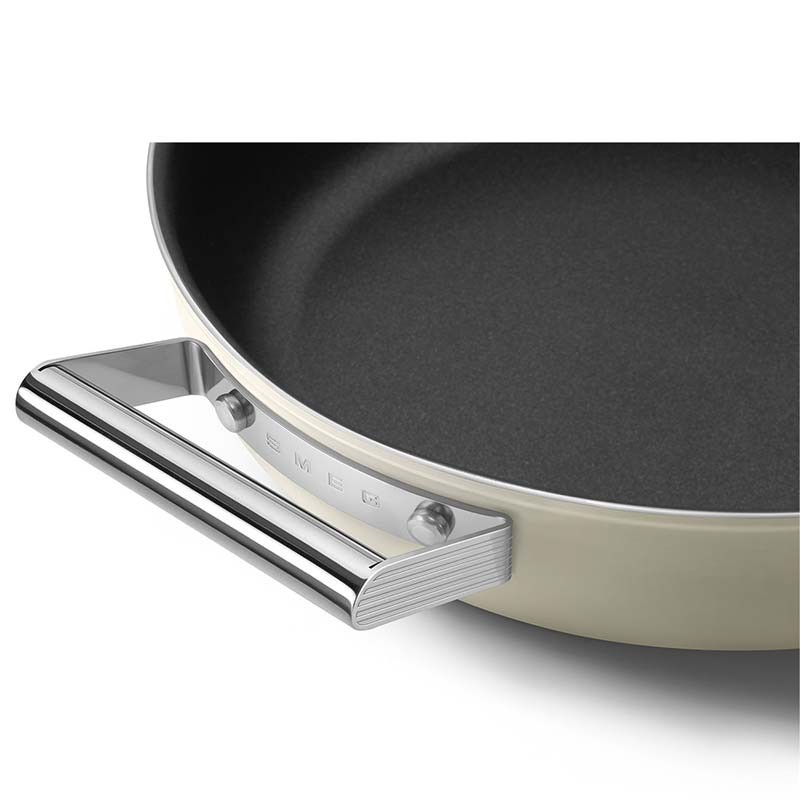 Casseruola bassa antiaderente con coperchio stile Smeg 50 di 28 cm di diametro, corpo in alluminio forgiato e finitura esterna beige crema opaca.