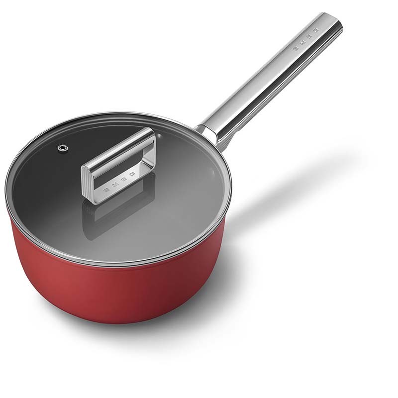 Casseruola antiaderente con coperchio in stile Smeg 50 di 20 cm di diametro, corpo in alluminio forgiato e finitura esterna rossa opaca.