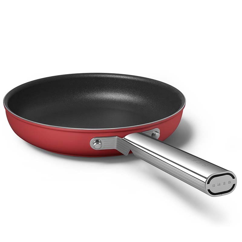 Padella antiaderente stile Smeg 50's diametro 24 cm, corpo in alluminio forgiato e finitura esterna rosso opaco.