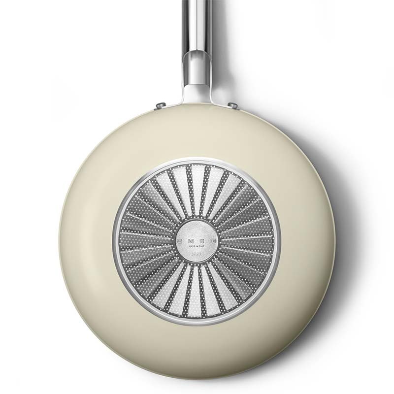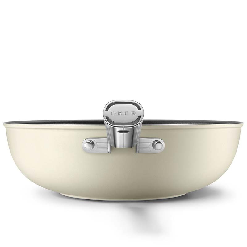 Smeg 50's Style antiaderente wok 30 cm di diametro, corpo in alluminio forgiato e finitura esterna beige crema opaca.